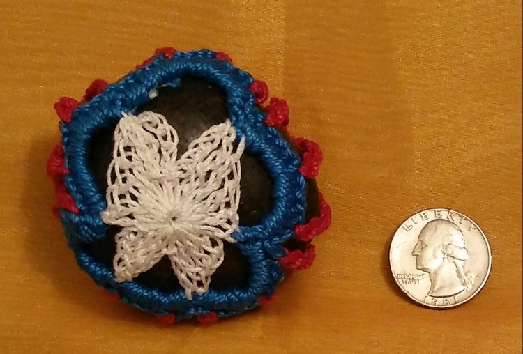 White Blue & Red Butterfly Stone: Crocheted-covered, black stone with white butterfly pattern. $14.99 (including shipping and tax).