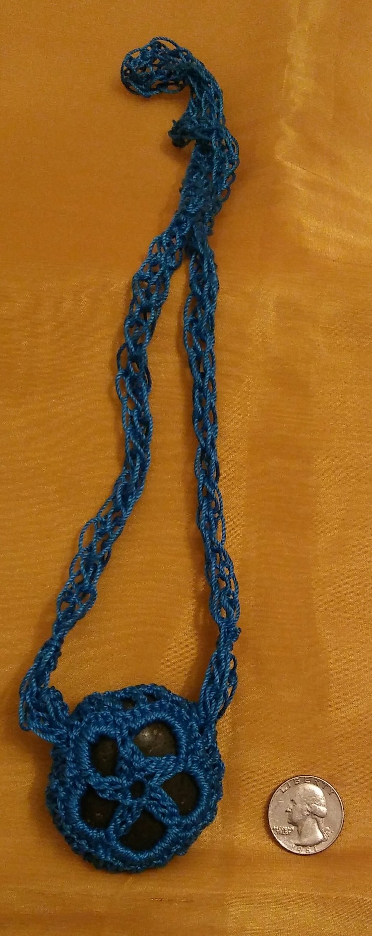 Gem Rock-star Stone Pendant: Crocheted-covered, black stone with blue star pattern + crocheted strand for wearing or hanging up. $14.99 (including shipping and tax).