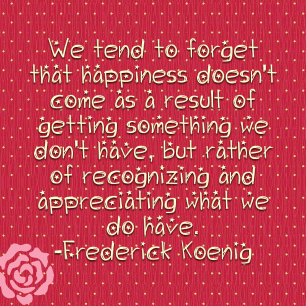 “We tend to forget that happiness doesn’t come as a result of getting something we don’t have, but rather of recognizing and appreciating what we do have.” ~Frederick Koenig