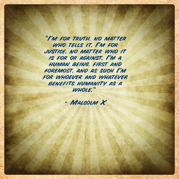 “I’m for truth, no matter who tells it. I’m for justice, no matter who it is for or against. I’m a human being, first and foremost, and as such I’m for whoever and whatever benefits humanity as a whole.”~Malcolm X