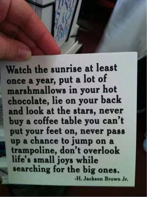 “Watch the sunrise at least once a year, put a lot of marshmallows in your hot chocolate, lie on your back and look at the stars, never buy a coffee table you can’t put your feet on, never pass up a chance to jump on a trampoline, don’t overlook life’s small joys while searching for the big ones.”~H. Jackson Brown Jr.