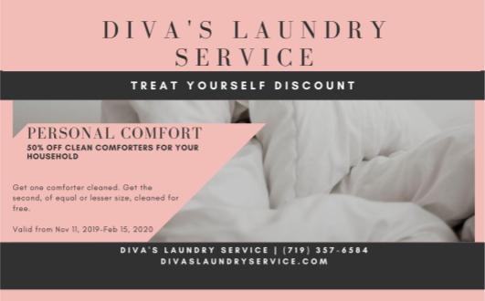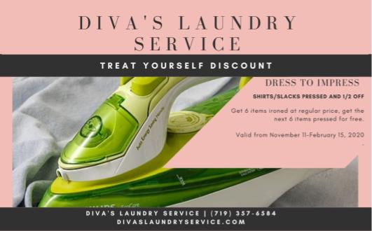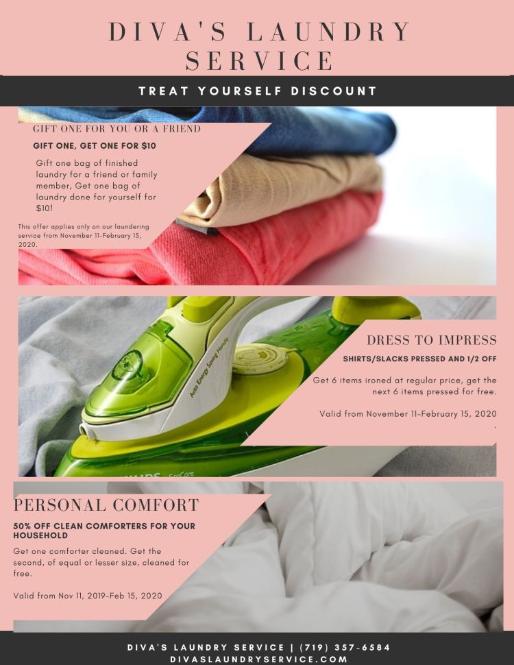 From now until May 15, 2020 (updated), Diva’s Laundry Service is going to give you the Treat Yourself Discount on all of our services: