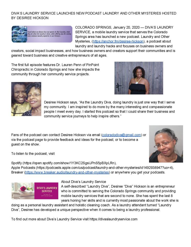 COLORADO SPRINGS, January 20, 2020 — DIVA’S LAUNDRY SERVICE, a mobile laundry service that serves the Colorado Springs area has launched a new podcast. Laundry and Other Mysteries, (https://anchor.fm/desiree-hickson), a podcast about laundry, laundry tips, and tricks and focuses on business owners and creators, social impact businesses, and how business owners and creators support their communities and is geared toward business and creative entrepreneurs of all ages.