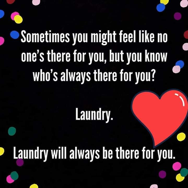 Laundry Laughs: Always There For You Posted byDivaFebruary 3, 2020February 2, 2020Posted inJust For Fun, Laundry Day, Laundry Laughs, Random MusingsTags:jokes, laughs, laundry jokes, Laundry Laughs Sometimes you might feel like no one’s there for you, but you know who’s always there for you?Laundry.Laundry will always be there for you. Share this: Click to share on X (Opens in new window) X Click to share on Facebook (Opens in new window) Facebook Like Loading... Related Published by Diva Trying to live my best life, but chores keep getting in the way! View more posts