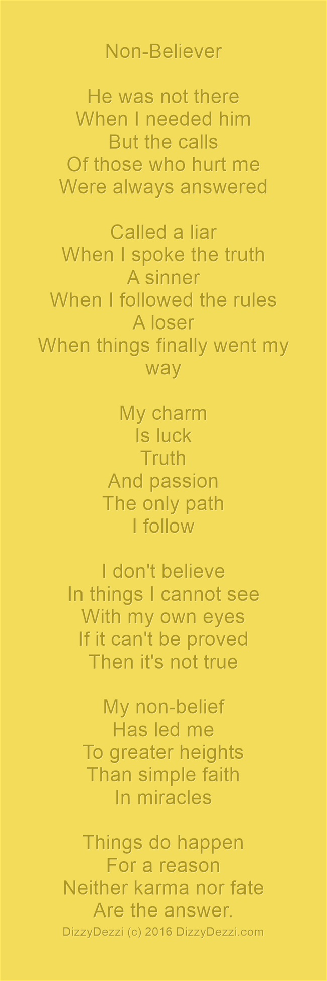 He was not there When I needed him But the calls Of those who hurt me Were always answered Called a liar When I spoke the truth A sinner When I followed the rules A loser When things finally went my way My charm Is luck Truth And passion The only path I follow IContinueContinue reading “Non-Believer”