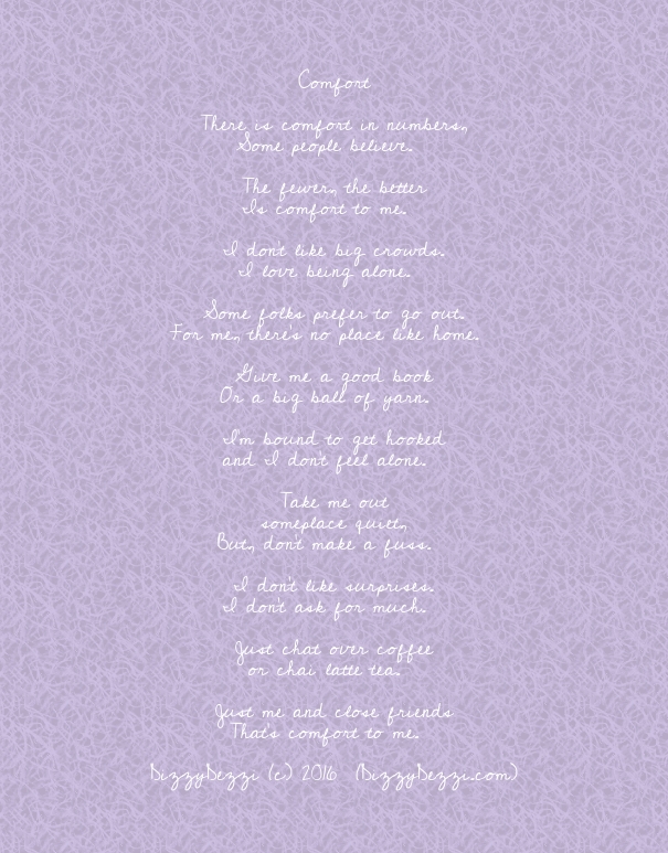 There is comfort in numbers, Some people believe. The fewer, the better Is comfort to me. I don’t like big crowds. I love being alone. Some folks prefer to go out. For me, there’s no place like home. Give me a good book Or a big ball of yarn. I’m bound to get hooked andContinueContinue reading “Comfort”