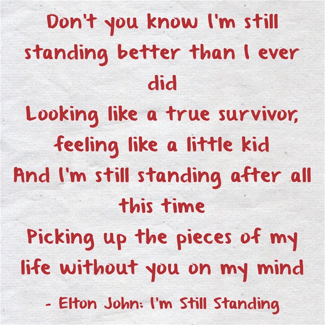 Don’t you know I’m still standing better than I ever did Looking like a true survivor, feeling like a little kid And I’m still standing after all this time