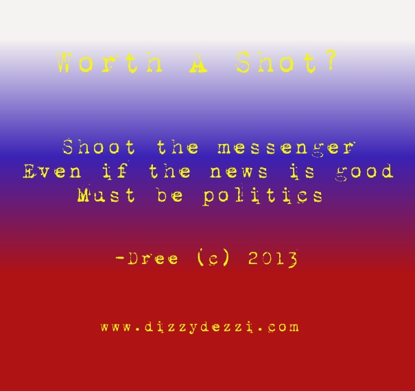 Shoot the messenger Even if the news is good Must be politics -Dree (c) 2013