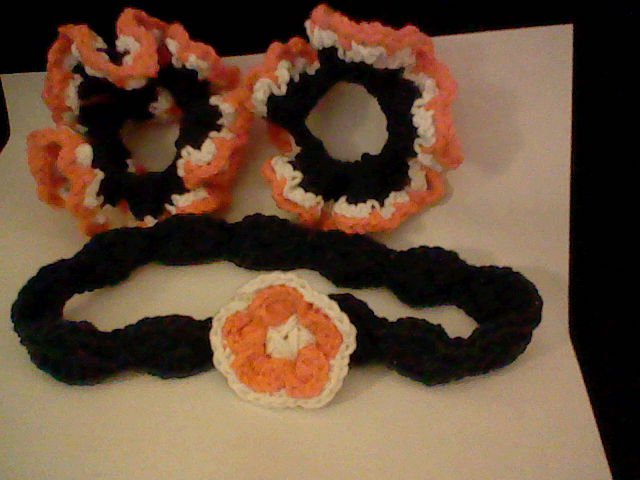 I call this my “Team Spirit” collection because the colors were inspired by my favorite football team. Two crocheted hair scrunchies and a crocheted shell headband with duo-colored flower, made using cotton yarn.